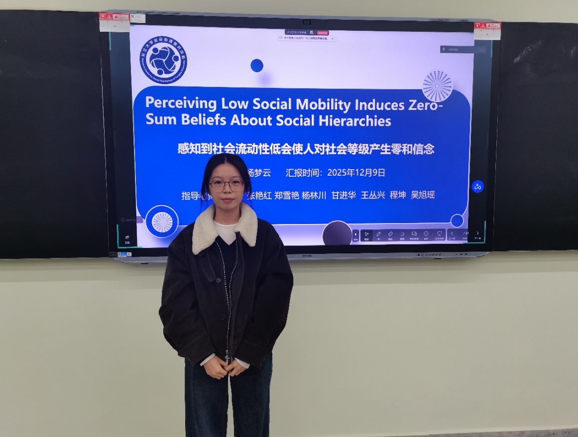 该研究通过整合中美样本、相关与实验结合的五项研究及60国补充数据,系统检验了“低主观社会流动感知→稀缺心态→零和信念→攻击性”的理论路径。研究结果明确了低主观社会流动感知对零和信念的预测作用,并验证了稀缺心态在其中所起的核心中介机制,同时排除了潜在的替代解释。在汇报的最后,杨梦云同学分享了该研究在理解零和信念成因、减少社会攻击性方面的理论价值,以及为优化社会氛围所提供的实践启示。