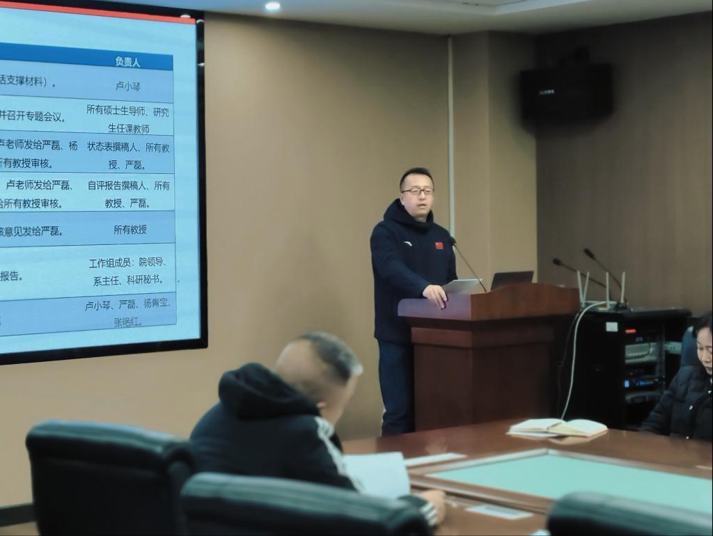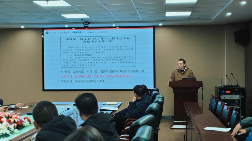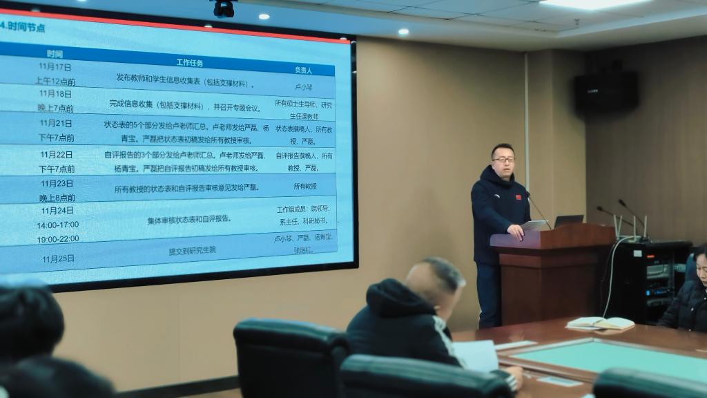 会上,经理助理严磊博士围绕评估指标体系,结合体育学学科发展实际,对前期评估筹备工作进行了全面细致的总结分析,对下一步推进工作进行任务分工。他从材料梳理、团队建设、教学改革、特色凝练等关键环节入手,明确了各工作小组的具体任务与时间节点,要求全体参会人员对照任务清单,压实工作责任,确保每项工作落地见效、有据可查。杨青宝副经理就评估材料准备、数据填报的相关注意事项作了说明。