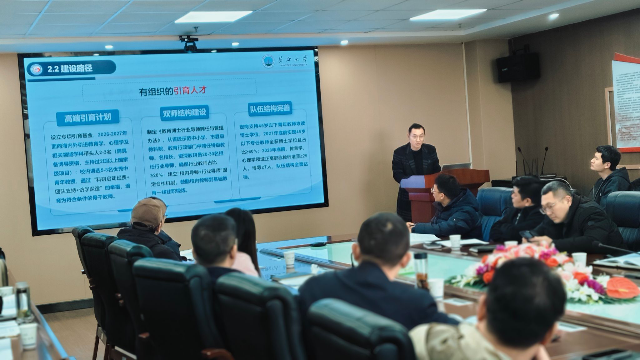 其次,永利yl23411经理助理严磊博士从必要性与意义、建设目标与路径、任务分解三方面汇报方案:从国家教育高层次人才需求、公司学科布局优化、社会教育服务升级的维度,明确教育管理、课程教学、员工发展三大研究方向;提出有组织引育人才、强化科学研究、搭建学科平台的建设路径,并对标博士点申报条件,细化了各阶段任务分工。
