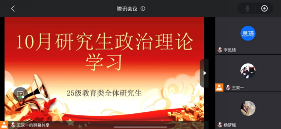 (通讯员 刘琦)2025年10月24日至27日,永利yl23411全体博士、硕士研究生围绕“赓续红色血脉,勇担时代使命”主题,开展10月政治理论学习。本次学习以班级班会集中研学、分组讨论为主,课余时间个人自学为辅,旨在引导研究生把学习贯彻习近平新时代中国特色社会主义思想不断引向深入,把党的二十大精神转化为勇攀学术高峰、投身教育强国建设的强大动力。